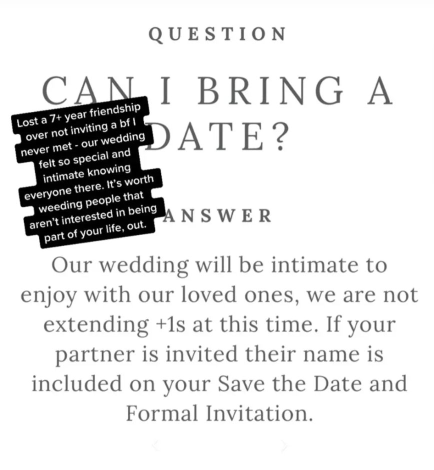 «Οι Συχνές Ερωτήσεις υπήρχαν επειδή κάναμε έναν σκόπιμα μικρό γάμο και θέλαμε να γνωρίζουμε κάθε άτομο εκεί», σημείωσε. «Αλλά πολλοί άνθρωποι έχουν τον κανόνα “Χωρίς δαχτυλίδι, δεν υπάρχει πρόσκληση”, και εμείς δεν ήμασταν τόσο αυστηροί σε αυτό».