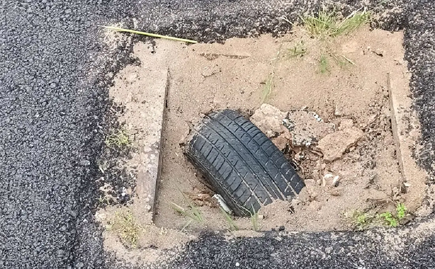 Στον ασφαλτοστρωμένο δρόμο διακρίνεται μία τρύπα και μέσα σε αυτήν βρίσκεται…. ξεχασμένη μία ρόδα Ι.Χ.