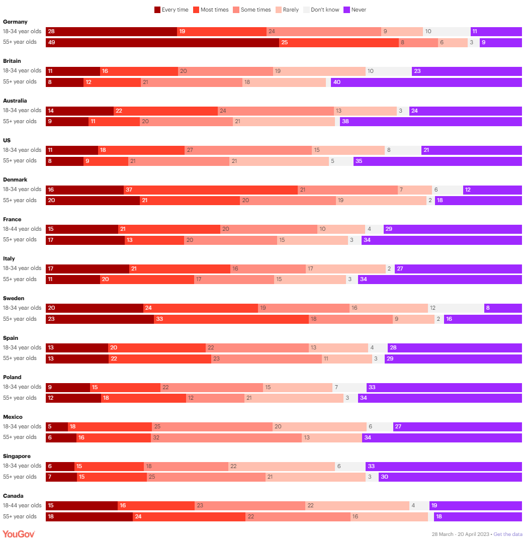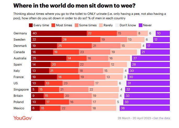 Η δημοσκόπηση που πραγματοποιήθηκε από το Yougov, δείχνει πως στη Γερμανία πάνω από 62% των ανδρών επιλέγουν να ουρούν καθισμένοι «κάθε φορά ή τις περισσότερες φορές» που πηγαίνουν στην τουαλέτα.