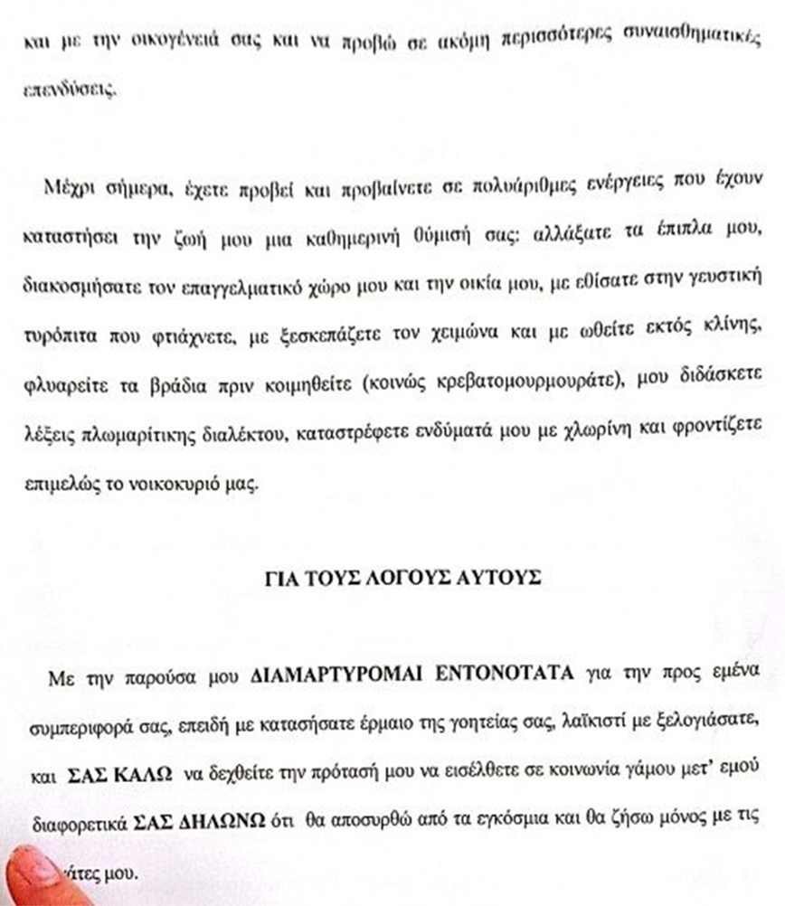 «Με την παρούσα μου διαμαρτύρομαι εντονότατα για την προς εμένα συμπεριφορά σας, επειδή με καταστήσατε έρμαιο της γοητείας σας, λαϊκιστί με ξελογιάσατε και σας καλώ να δεχτείτε την πρότασή μου να εισέλθετε σε κοινωνία γάμου μετ’ εμού διαφορετικά σας δηλών ότι θα αποσυρθώ από τα εγκόσμια και θα ζήσω μόνος…».
