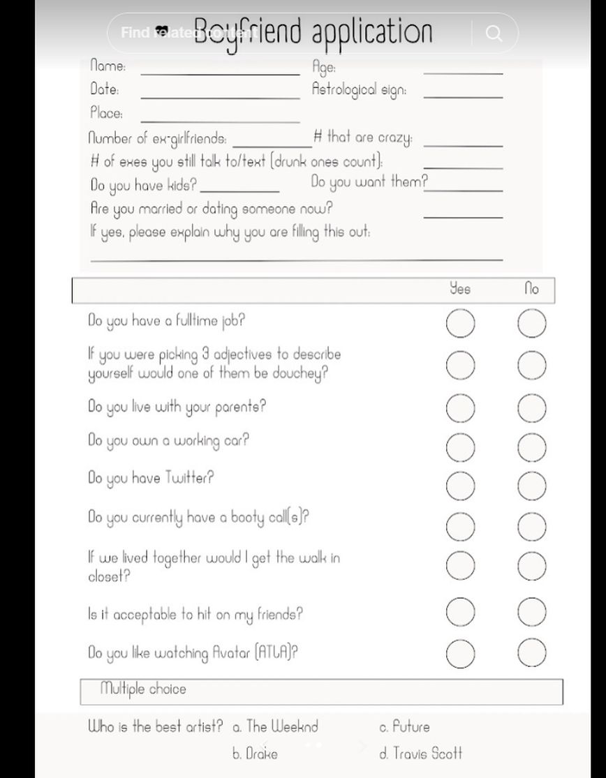Το μοντέλο ρωτά επίσης για το ζώδιο του αιτούντος και πόσες πρώην φίλες είχε, προτού προχωρήσει σε μια σειρά από ερωτήσεις της μορφής «ναι ή όχι».
