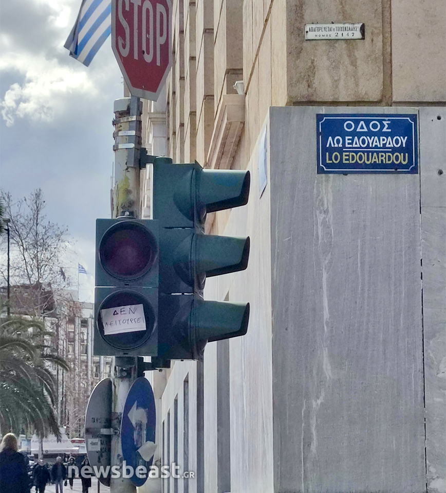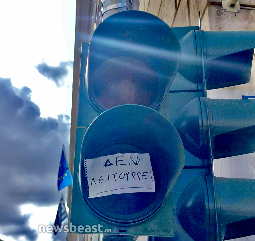 Ο φωτεινός σηματοδότης είναι σβηστός καθώς βρίσκεται εκτός λειτουργίας και στο χαρτάκι που έχει κάποιος κολλήσει επάνω του γράφει: «Δεν λειτουργεί».
