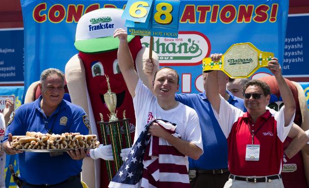 Ο Joey Chestnut είναι ο νικητής του διαγωνισμού «Hot dog-eating» στο Coney Island της Νέας Υόρκης, καταβροχθίζοντας 68 χοτ ντογκ!
