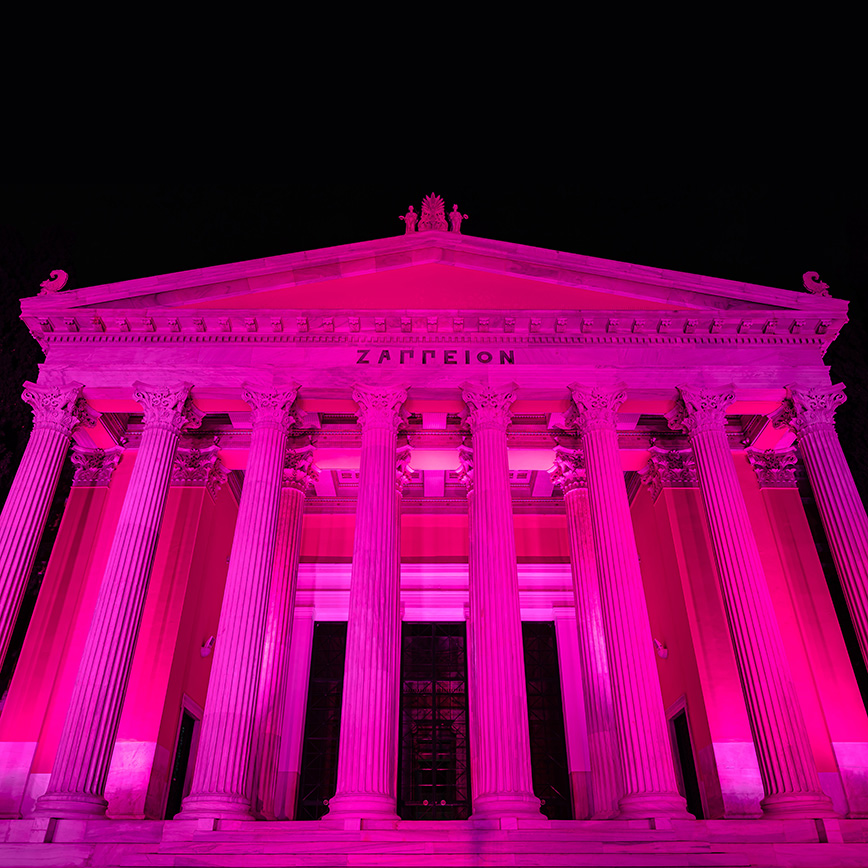 Το ιστορικό και εμβληματικό κεντρικό κτίριο του Ζαππείου Μεγάρου φωταγωγήθηκε φέτος με το χαρακτηριστικό ροζ χρώμα, στo πλαίσιo της παγκόσμιας πρωτοβουλίας φωταγώγησης μνημείων και κτηρίων οροσήμων, για την εκστρατεία ενημέρωσης για τον καρκίνο του μαστού, της The Estée Lauder Companies.