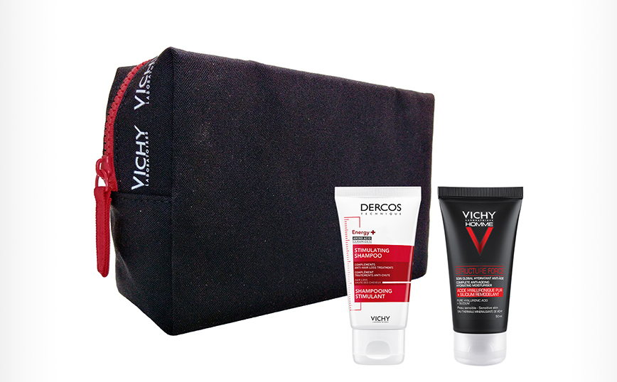 Τα Χριστούγεννα γίνονται μαγικά και για τους άνδρες, με τα μαύρα Xmas Pouches της Vichy, στα οποία μπορείτε να βρείτε την Structure Force, την αντιρυτιδική κρέμα ημέρας για άνδρες, που παρέχει 24ωρη ενυδάτωση και δρα ενάντια στα σημάδια γήρανσης της ανδρικής επιδερμίδας, όπως την απώλεια σφριγηλότητας, τις ρυτίδες γύρω από τα μάτια, την υφή της επιδερμίδας και τη χαλάρωση. Τα μαύρα Xmas pouches, συνοδεύονται από το δυναμωτικό σαμπουάν της σειράς Dercos, Dercos Energy +, που είναι κατάλληλο για ευαίσθητο τριχωτό και μειώνει την τριχόπτωση, ενισχύοντας την τρίχα και το τριχωτό.