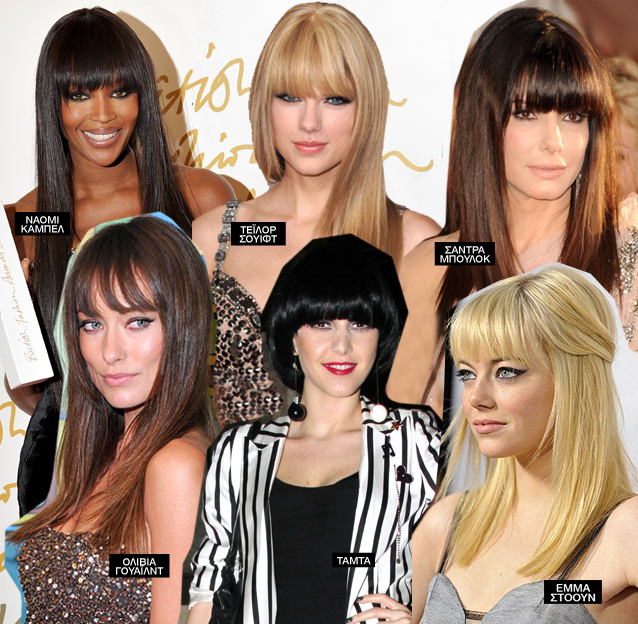 Ο hair stylist που επιμελήθηκε το look της Ολίβια Γουάιλντ, Τέρι Μίλετ, δημιούργησε ένα ultra chic αποτέλεσμα με γαλλική φινέτσα, χρησιμοποιώντας προϊόντα Kerastase και δίνοντας την τελική πινελιά στις άκρες με το best seller προϊόν της εταιρίας, Oléo-Relax Serum, για να δώσει λάμψη και να καταπολεμήσει το φριζάρισμα. Σε διαφορετικό στιλ, αλλά με κοινό παρονομαστή της αφέλειες κινήθηκε η Σάντρα Μπούλοκ, η οποία προτίμησε ένα (αμφιλεγόμενο) look με αναφορά στα ‘60s, με γεμάτες, «βαριές» αφέλειες. Ο Ντέιβιντ Μπαμπάι που επιμελήθηκε το χτένισμά της, χρησιμοποίησε για τις αφέλειες ισιωτικό σίδερο, το οποίο γύριζε ελαφρά προς τα μέσα στο τελείωμα για να χαρίσει απαλότητα στο look. Φυσικά στις πρώτες Ελληνίδες φέτος που υιοθέτησαν την τάση ανήκει η Τάμτα, την οποία είδαμε στο Gazoo με μία πολύ διαφορετική εμφάνιση, φορώντας bob περούκα με αφέλειες.
