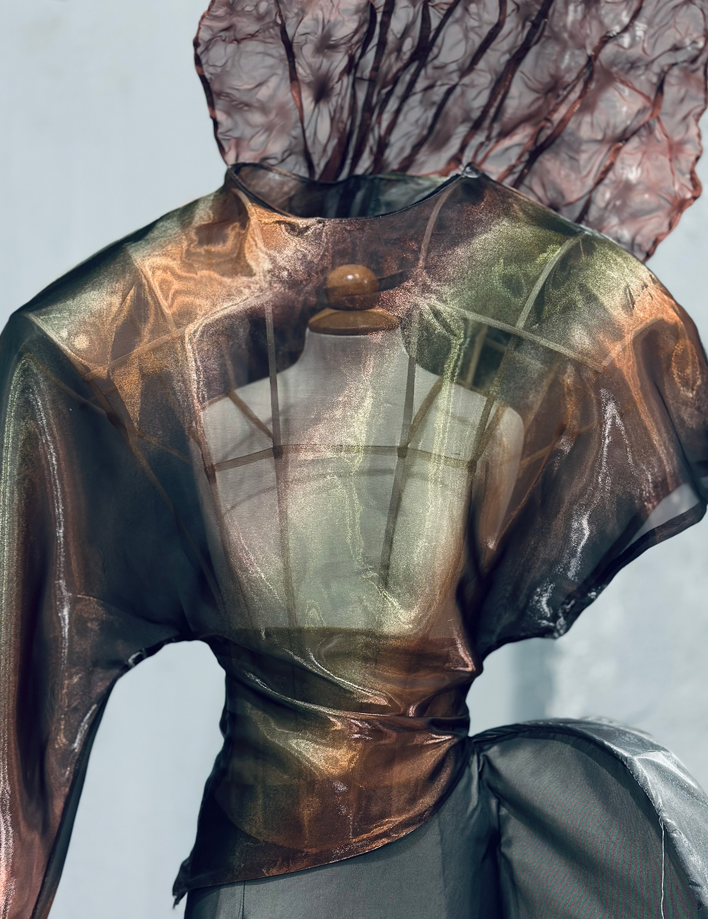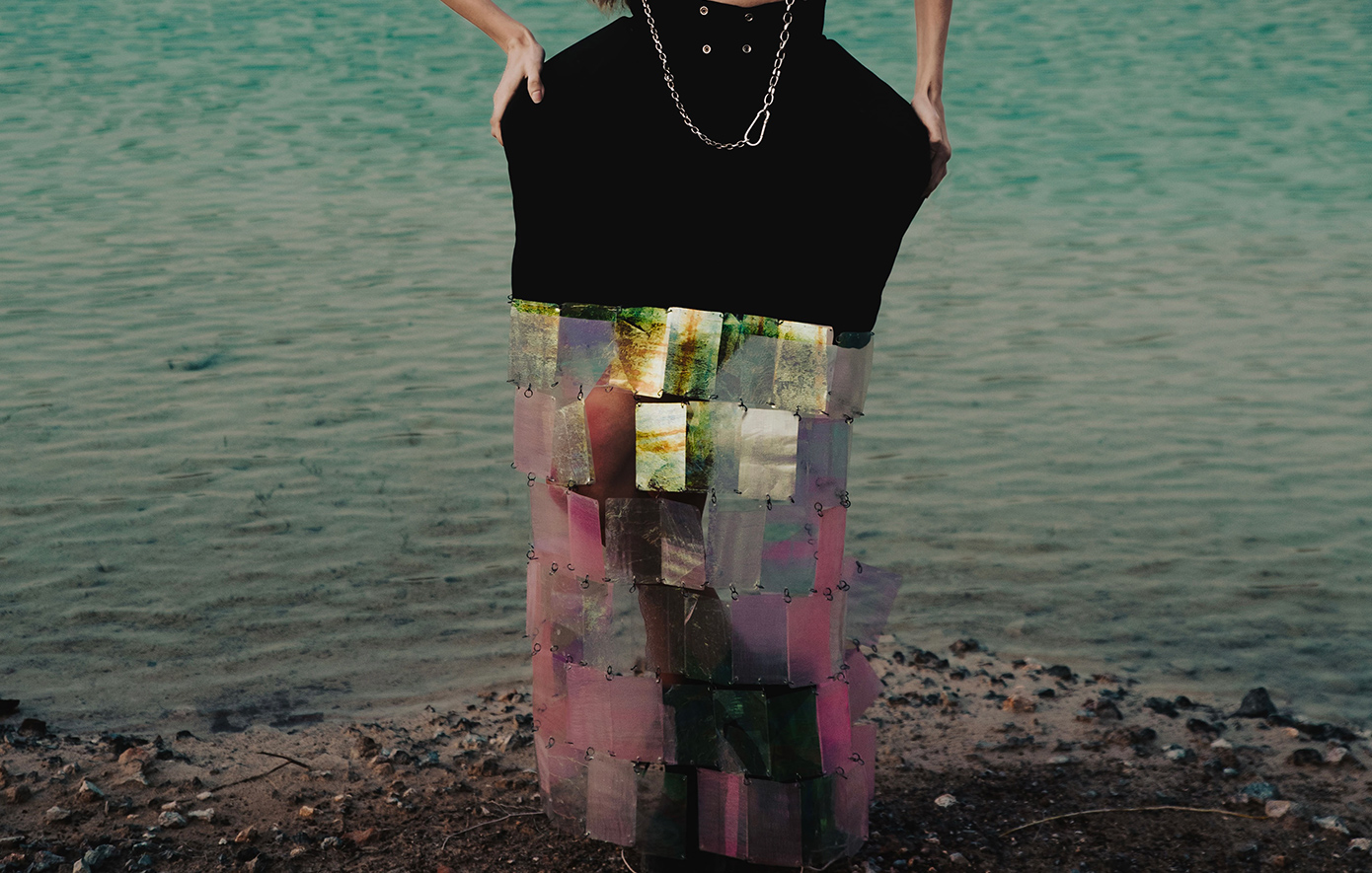 Μέσα από τις γλυπτικές φόρμες επιδιώκω να ερμηνεύσω τη σχέση του σώματος με το περιβάλλον, τις μεταβολές σε σχέση με αυτό. Οι δημιουργίες μου δε λειτουργούν στο να ντύνουν απλώς το σώμα, αλλά γίνονται οργανικά κομμάτια αυτού ως συνέχεια του. Σχήματα εμπνευσμένα από οργανικές υφές, υφάσματα που προσαρμόζονται ανάλογα με το φως και τις αντανακλάσεις δίνοντας μια νέα ζωή στο ένδυμα, δομές που κινούνται με τον αέρα και άλλοτε στέκονται έξω από το σώμα. Η φύση λειτουργεί ως προέκταση αυτού, συμβολίζοντας έννοιες όπως η μεταμόρφωση, η αναγέννηση και η άνθιση μέσα σε μια εποχή που όλα εξελίσσονται με γρήγορους ρυθμούς. Είναι σημαντικό να μπορείς να ορίσεις την ταυτότητα σου μέσα στο σύνολο και όχι να προσαρμόζεσαι απλώς σε αυτό.