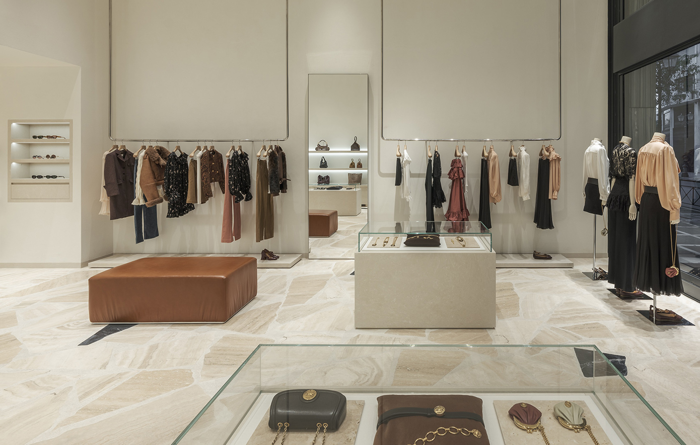 Η μπουτίκ διαθέτει συλλογές prêt-à-porter, δερμάτινα είδη, υποδήματα και αξεσουάρ, στεγασμένα σε ένα φωτεινό εσωτερικό που αντικατοπτρίζει τους διαχρονικούς κώδικες της Chloé. Η αρχιτεκτονική γλώσσα του χώρου ενσωματώνει το DNA του γαλλικού Οίκου, επανερμηνευμένο μέσα από ένα σύγχρονο αρχιτεκτονικό πρίσμα. Τοίχοι σε απαλές λευκές υφές ενισχύουν τη φωτεινότητα και την καθαρότητα, ενώ δάπεδα από μπεζ μάρμαρο με έμπνευση από terrazzo προσδίδουν διακριτική κομψότητα. Λεπτομέρειες από ασβεστόλιθο, ζεστός φωτισμός και καθρέφτες δημιουργούν βάθος και οικειότητα. Μία κεντρική κολόνα, πλαισιωμένη από καμπύλα ράφια, αγκυρώνει τον χώρο με ρευστότητα και ισορροπία.