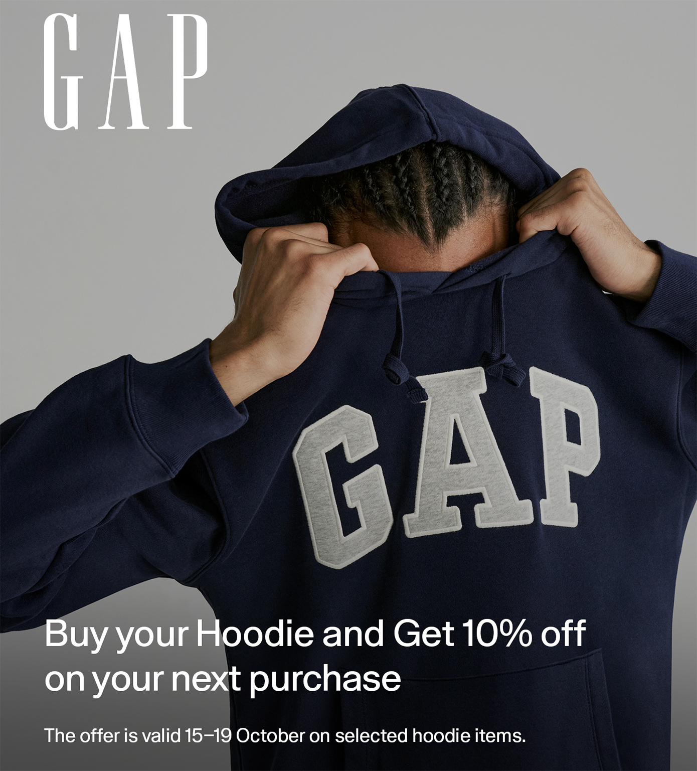 Παράλληλα, για να τιμήσει τη φετινή επέτειο, η Gap προσφέρει σε όλους τους πελάτες κουπόνι έκπτωσης 10% για την επόμενη αγορά τους, με κάθε αγορά hoodie στις 15 & 16 Οκτωβρίου, τόσο στα φυσικά καταστήματα όσο και στο eshop.