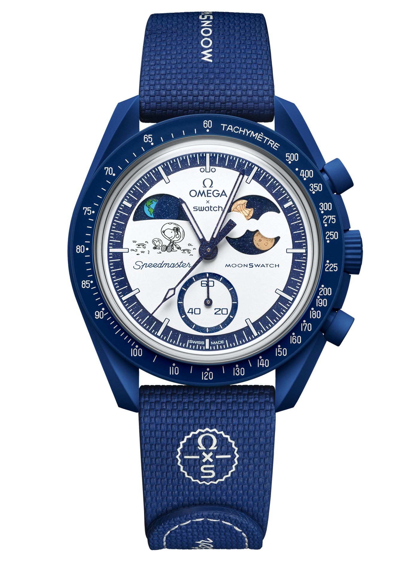 Αυτό το νέο ρολόι διαθέτει την ίδια αστρική διάταξη στο καντράν με τα προηγούμενα ρολόγια και περιλαμβάνει την καινοτόμο ένδειξη φάσεων της Γης της Swatch, ένδειξη φάσεων της Σελήνης διακοσμημένη με το MoonshineTM Gold της OMEGA και εικονογραφήσεις από τον κόσμο του Snoopy. Όπως όλα τα σχέδια Bioceramic MoonSwatch, αυτό το MISSION TO EARTHPHASE – MOONSHINE GOLD έχει κατασκευαστεί από το κατοχυρωμένο με δίπλωμα ευρεσιτεχνίας Bioceramic της Swatch, ένα μείγμα κεραμικού και υλικών βιολογικής προέλευσης από καστορέλαιο και διατίθεται σε ξεχωριστό σκούρο μπλε μαρίν χρώμα.