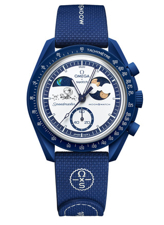 Στο καντράν και την κορώνα του κατέχουν περίοπτη θέση τα λογότυπα OMEGA X Swatch και στο καπάκι της κάσας του είναι χαραγμένη η δήλωση αποστολής του. Στο καπάκι της μπαταρίας περιλαμβάνεται ένα σχέδιο εμπνευσμένο από τη Γη, ενώ το λουράκι VELCRO® από καουτσούκ σε μπλε μαρίν προσθέτει μια cool αστροναυτική πινελιά.