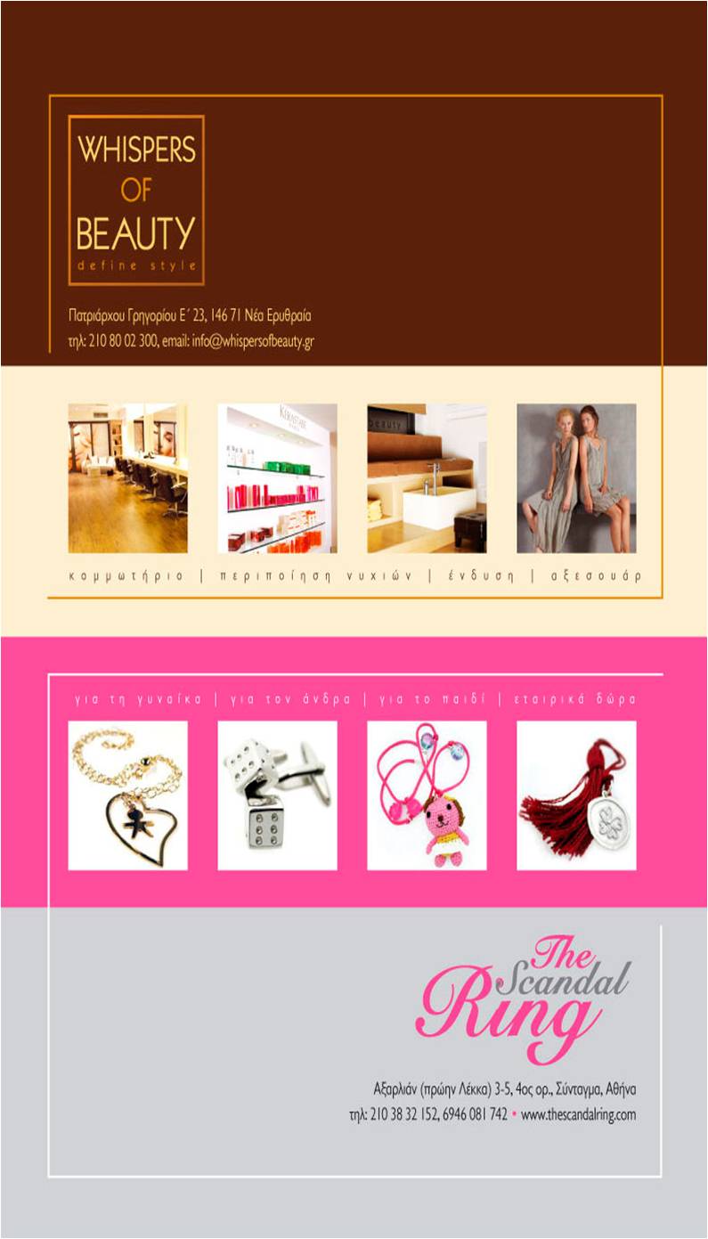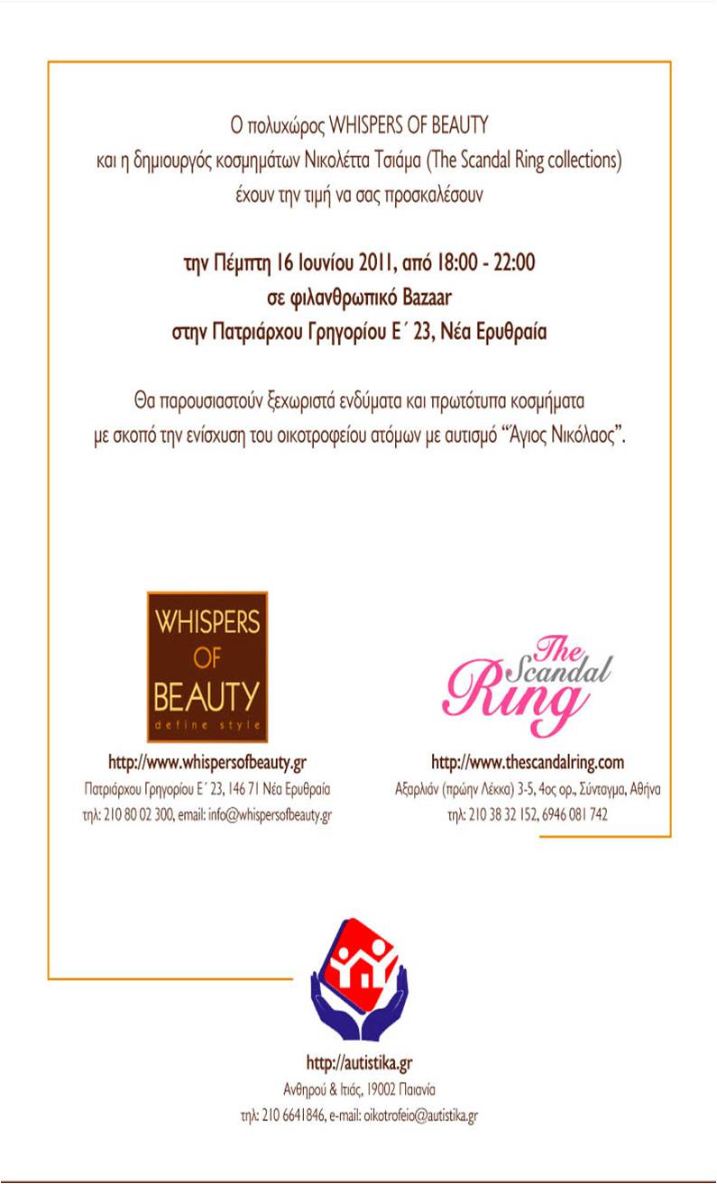 Ο πολυχώρος «Whispers of beauty» και η δημιουργός κοσμημάτων Νικολέττα Τσιάμα (The Scandal Ring Collections) σας προσκαλούν σε φιλανθρωπικό bazaar, την Πέμπτη 16 Ιουνίου στις 18:00-22:00, στην Πατριάρχου Γρηγορίου Ε΄ 23 στη Νέα Ερυθραία.