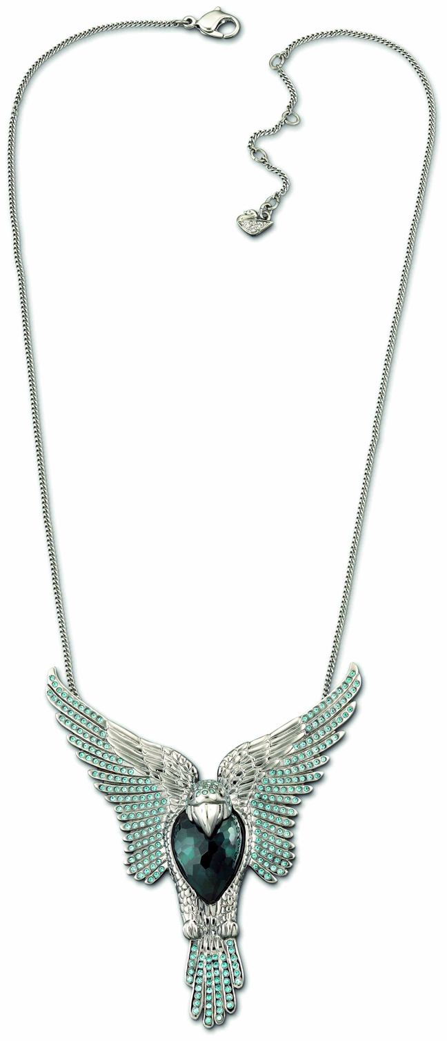 Τέλος, η φιγούρα του πουλιού επαναλαμβάνεται δημιουργικά και στο μενταγιόν «Phenix», το οποίο εκφράζει τη σαγηνευτική ροκ πλευρά της καλλιτέχνιδας. Διάπλατα ανοιχτά, τα φτερά με επιμετάλλωση από ασήμι εντυπωσιάζουν χάρη στα τιρκουάζ κρύσταλλα pavé και στο τεράστιο κρύσταλλο σε έντονο βιολετί τοποθετημένο κάτω από το ράμφος. Το κομμάτι συμπληρώνει το εντυπωσιακό μενταγιόν «Pure» που αποτελείται από ένα μεγάλο κρύσταλλο σε σχήμα σταγόνας, το οποίο αναδεικνύεται από χρωματικά κρύσταλλα τοποθετημένα με την τεχνική Pointiage®.