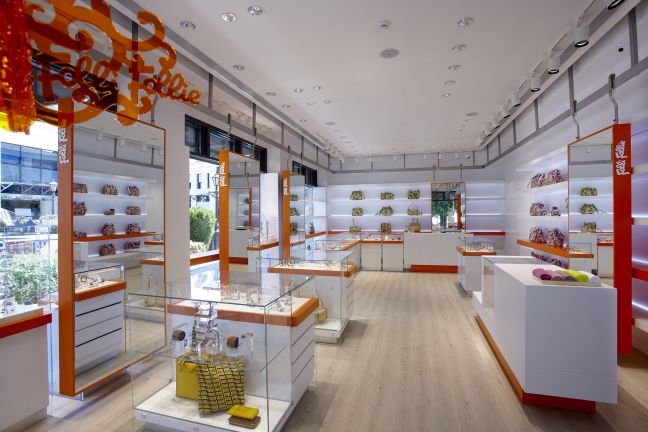 Στο χώρο επικρατεί το πορτοκαλί χρώμα, σήμα κατατεθέν του brand, καθώς και η νέα καμπάνια της Folli Follie με την Gaile Lai.