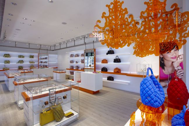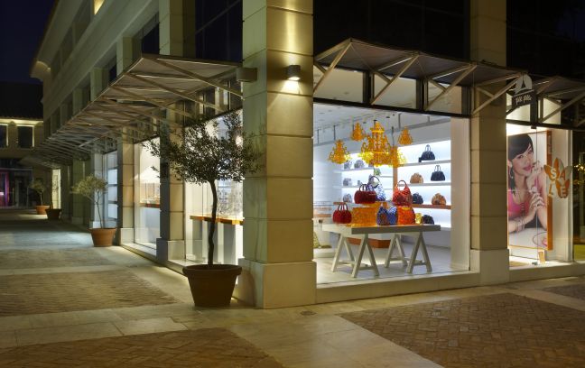 Στη φωτεινή βιτρίνα του καταστήματος, το ειδικά σχεδιασμένο διάφανο-πορτοκαλί «chandelier», εγκλωβίζει το φως και αποκαλύπτει το καλλιτεχνικά ενσωματωμένο λογότυπο Folli Follie.