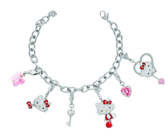 Ένα κλασικό συλλεκτικό κομμάτι Swarovski είναι το βραχιόλι-αλυσίδα με γούρια που μπορείτε να αλλάζετε. Τα κομμάτια Hello Kitty με τον φιόγκο από ροζ πολυεδρικό κρύσταλλο έχουν δημιουργηθεί εξολοκλήρου με την τεχνική Pointiage ή από χρωματιστά κρύσταλλα pavé. Αυτή η λεπτεπίλεπτη αλυσίδα αποκτά ζωντάνια χάρη στο διαφανές, κόκκινο και ροζ κρύσταλλο.