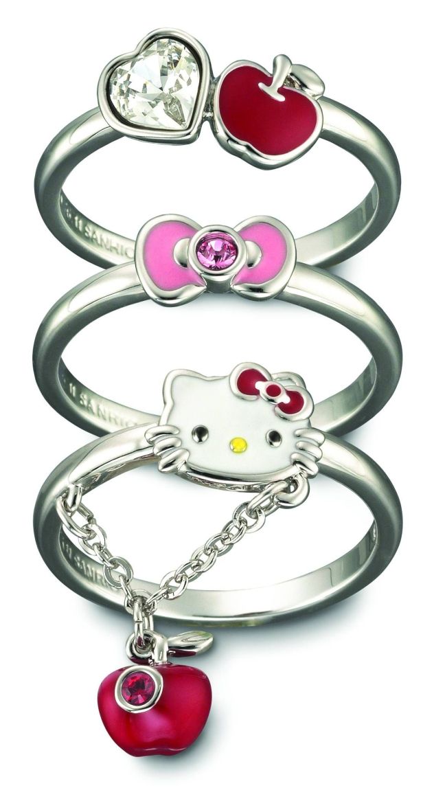 Η γοητευτική συλλογή κοσμημάτων συμπληρώνεται με δύο δαχτυλίδια. Το ένα σετ αποτελείται από τρία δαχτυλίδια, τα οποία περιλαμβάνουν το πρόσωπο, το φιόγκο και το μήλο της Hello Kitty.