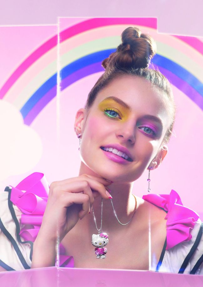 Άμεσα αναγνωρίσιμη σε όλο τον κόσμο, η Hello Kitty έχει πλήθος θαυμαστών κάθε ηλικίας. Για τη δημιουργία των κομματιών με τη μορφή της Hello Kitty, η οποία είναι γνωστή για τα ιδιαίτερα χαρακτηριστικά και τον φιόγκο-σήμα κατατεθέν πάνω από το αριστερό αφτί της, χρειάστηκε να επιστρατευτεί όλη η υψηλή τεχνογνωσία της Swarovski.
