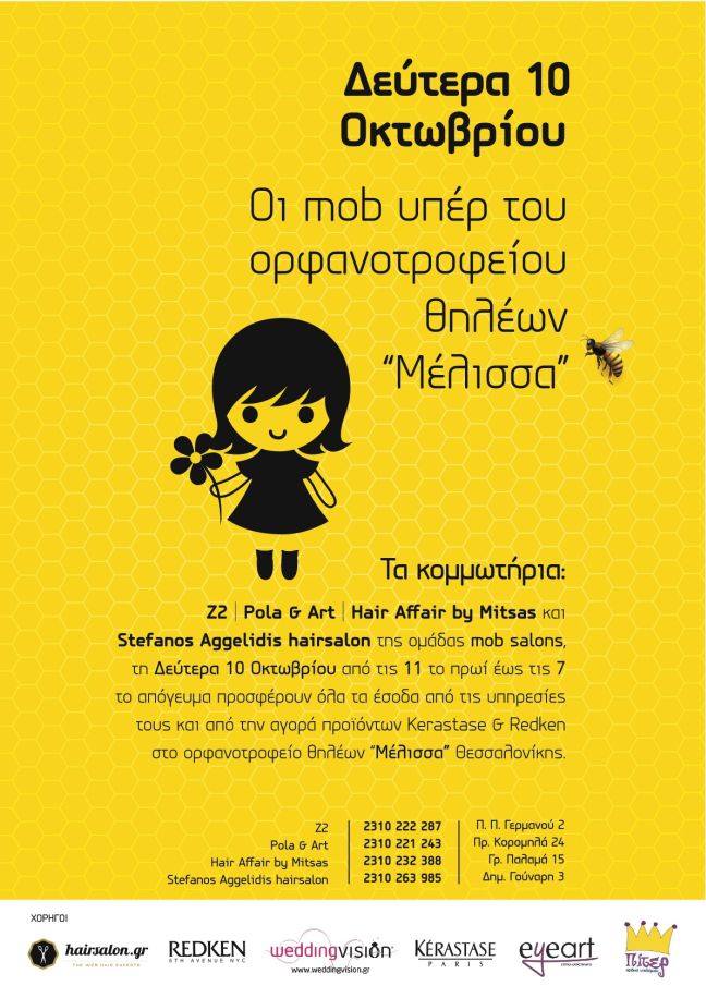 Τα κομμωτήρια Z2 – Pola & Art – Hair Afair by Mitsas και Stefanos Aggelidis hairsalon της ομάδας mob Salons, την Δεύτερα 10 Οκτωβρίου από τις 11 το πρωί έως τις 7 το απόγευμα, δουλεύουν για το ορφανοτροφείο θηλέων Μέλισσα Θεσσαλονίκης.