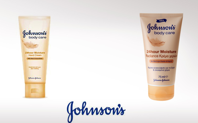 • Johnson’s 24hr Moisture Radiance Ηand Cream 75ml. Ενυδατώνει εντατικά την επιδερμίδα και ανακουφίζει τα ξηρά και σκασμένα χέρια από την πρώτη κιόλας χρήση, αφήνοντας την επιδερμίδα υπέροχα αρωματισμένη με νότες σοκολάτας!