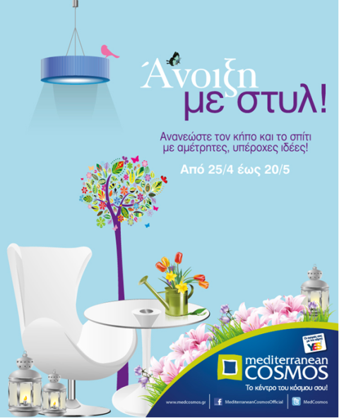Στο Mediterranean Cosmos και φέτος μύρισε… Άνοιξη! Ανακαλύψτε πλήθος φυτών και λουλουδιών που θα ομορφύνουν τον κήπο σας και ανανεώστε το σπίτι σας, επιλέγοντας ανάμεσα σε αμέτρητες μοναδικές ιδέες από τα καταστήματα Anemos, Cook Shop, Domus Homus, Flexa, Guy Laroche, Octopus, Oneiro Signe, Zara Home και Παρουσίαση.