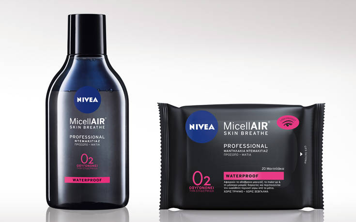 Η νέα σειρά NIVEA MicellAIR Professional αποτελείται από το νερό καθαρισμού δύο φάσεων και τα μαντηλάκια ντεμακιγιάζ, που εξαφανίζουν άμεσα και αποτελεσματικά ακόμα και το αδιάβροχο μακιγιάζ. Δεν χρειάζεται πλέον να παλεύεις να αφαιρέσεις το μακράς διαρκείας μακιγιάζ, τις σκούρες σκιές, το έντονο eyeliner ή την αδιάβροχη μάσκαρα, τρίβοντας επίμονα το πρόσωπό σου. Με τη νέα σειρά της NIVEA, η διαδικασία ντεμακιγιάζ γίνεται απλή και αποτελεσματική, με ελάχιστες κινήσεις και χωρίς να αφήνει υπολείμματα. Ακόμα, μπορείς ανά πάσα ώρα και στιγμή να διορθώσεις οποιοδήποτε λάθος σου στο μακιγιάζ, όπως μία στραβή γραμμή μολυβιού ή το κραγιόν, που ξέφυγε από το περίγραμμα, χωρίς να καταστρέψεις το τελικό αποτέλεσμα.