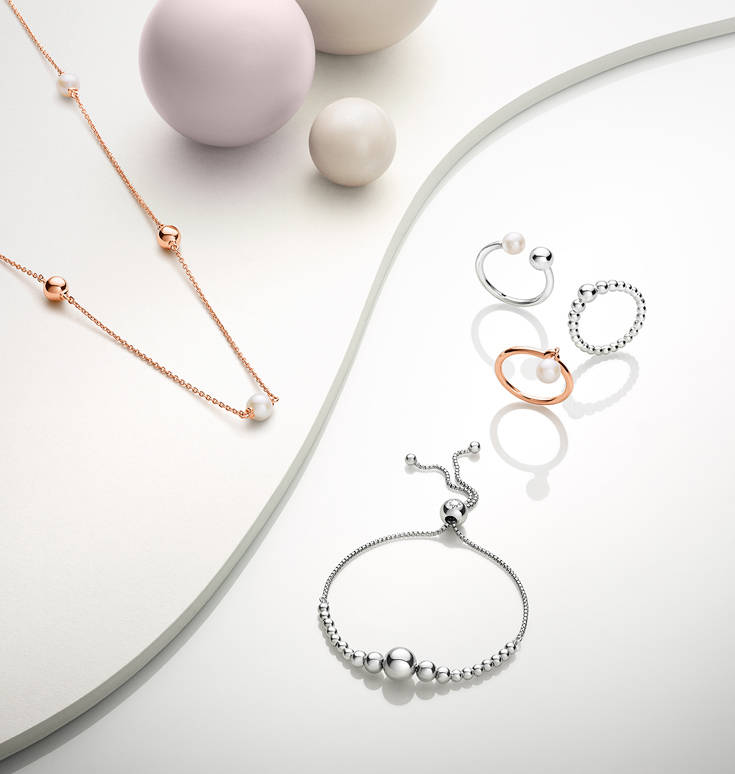 Signature μέταλλα υψηλής ποιότητας, όπως δροσερό μασίφ ασήμι και ζεστό PANDORA Rose, συνδυασμένα με φωτεινά μαργαριτάρια, χαρίζουν απλόχερα την αίσθηση αρμονίας και λάμψης.