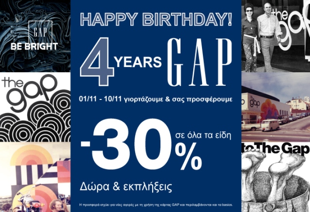 Αποκλειστικά και μόνο για το διάστημα των εορτασμών, από Πέμπτη 1 έως Σάββατο 10 Νοεμβρίου, τα Gap θα γιορτάσουν τα γενέθλιά τους προσφέροντας, με την επίδειξη της Κάρτας Gap, γενέθλια… έκπτωση 30% για κάθε αγορά ρούχων και αξεσουάρ από τη Φθινοπωρινή αλλά και Basic γυναικεία, ανδρική, παιδική και βρεφική συλλογή, δίνοντάς μας την ευκαιρία να ανανεώσουμε τη διάθεση αλλά και την γκαρνταρόμπα μας, με νέα Gap fashion statement από την: