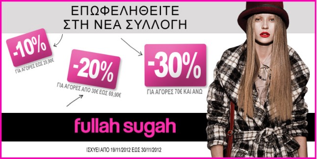 Επισκεφθείτε ένα από τα ομώνυμα καταστήματα της Fullah Sugah ή σερφάρετε στο online κατάστημα www.fullahsugah.gr και κερδίστε με αγορές έως 29,90 ευρώ έκπτωση 10%, με αγορές από 30 ευρώ – 69,90 ευρώ έκπτωση 20%, με αγορές άνω των 70 ευρώ έκπτωση 30%!