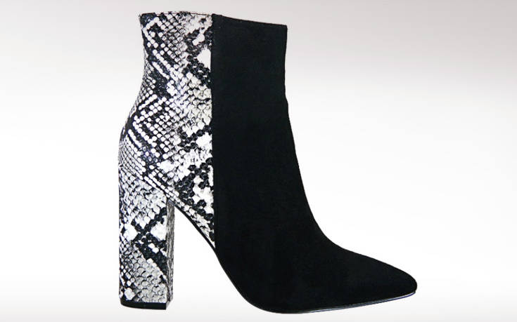 Η αποτύπωση του δέρματος του φιδιού αποτελεί αγαπημένο pattern της μόδας, εδώ και δεκαετίες. Φέτος, προτιμάται, κυρίως, στο τακούνι και συνδυάζεται άψογα και αρμονικά με μαύρο suede.
