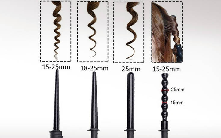 - 4 διαφορετικά αποσπώμενα εξαρτήματα για δημιουργία διαφορετικού τύπου μπούκλας, εκ των οποίων 2 με κωνικό σχήμα για χαλαρές και σφικτές μπούκλες ανάλογα τη χρήση (13mm - 25mm) και εξάρτημα για κύματα
