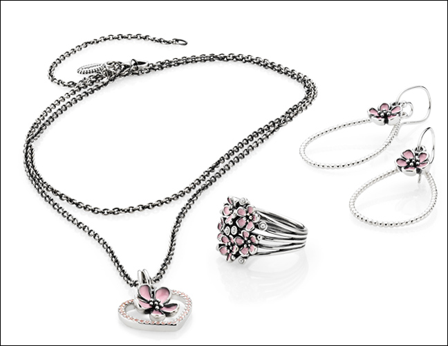 Το ροζ άνθος κερασιάς, βασική πηγή έμπνευσης της νέας συλλογής, διακοσμεί πολλά από τα χειροποίητα κοσμήματα φτιαγμένα από μασίφ ασήμι, χρυσό 14Κ και σμάλτο σε παστέλ αποχρώσεις.