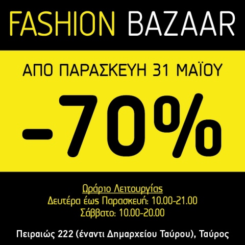 Αποκτήστε τα αγαπημένα σας επώνυμα brands σε ρούχα, παπούτσια και αξεσουάρ για άνδρες, γυναίκες αλλά και παιδιά, στο καλοκαιρινό Fashion Bazaar με έκπτωση -70% στο μοντέρνο χώρο της οδού Πειραιώς 222, στον Ταύρο (έναντι Δημαρχείου).