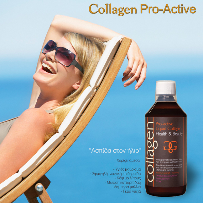 Το Collagen Pro- Active είναι το ιδανικό συμπλήρωμα διατροφής, που λόγω της ιδιαίτερης σύνθεσής του, επιτρέπει να απορροφάται και να χρησιμοποιείται άμεσα το κολλαγόνο από τον οργανισμό μας. Αυτή είναι άλλωστε και η μεγαλύτερη ασπίδα που μπορούμε πλέον να χρησιμοποιήσουμε, ώστε να απολαμβάνουμε την ηλιοθεραπεία και ταυτόχρονα να είμαστε πλήρως προστατευμένοι.