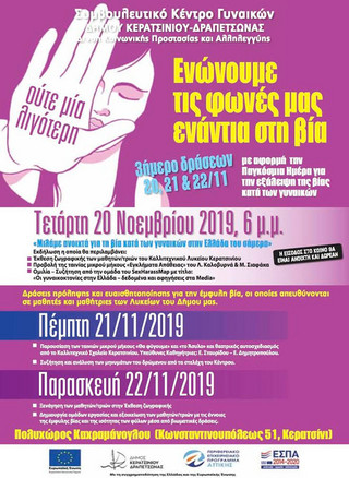 Το Συμβουλευτικό Κέντρο Γυναικών του Δήμου Κερατσινίου – Δραπετσώνας με αφορμή την 25η Νοεμβρίου, Παγκόσμια Ημέρα Εξάλειψης της Βίας κατά των Γυναικών, διοργανώνει 3ήμερο δράσεων με τίτλο «Ενώνουμε τις φωνές μας ενάντια στη βία».