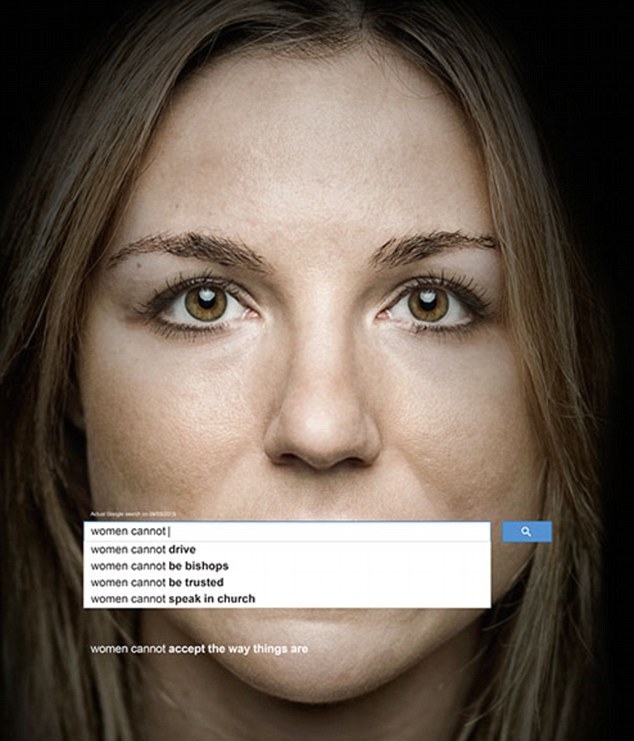 Όταν κανείς πληκτρολογούσε τις λέξεις «οι γυναίκες δε μπορούν…» στο πλαίσιο αναζήτησης, η μηχανή της Google πρότεινε τις εξής εκδοχές για να συνεχιστεί η πρόταση: «…να οδηγήσουν», «…να γίνουν ιερείς», «…να χαίρουν της εμπιστοσύνης σου» και «…να μιλήσουν στην εκκλησία».