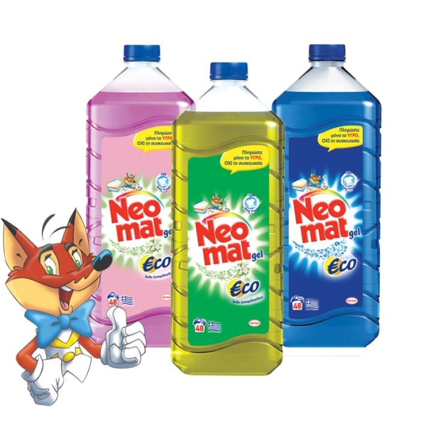 Κρατώντας το ίδιο υγρό Neomat και εξοικονομώντας από το κόστος του μπουκαλιού, το «Neomat €co» συνεχίζει να προσφέρει κάθε μέρα χαμηλές τιμές, ρούχα πραγματικά καθαρά και πλέον δίνει την επιλογή τριών υπέροχων αρωμάτων: του νέου άνθη εσπεριδοειδών, του οικείου αρώματος φρεσκάδας Neomat και του αγαπημένου αρώματος άγριο τριαντάφυλλο.