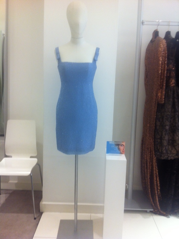 – Ένα κοντό φόρεμα σε χρώμα θαλασσί με χάντρες και τετράγωνο ντεκολτέ με μια λεπτομέρεια με φιόγκο. Είναι ένα ακριβές αντίγραφο του φορέματος που φόρεσε η Πριγκίπισσα Νταϊάνα στην πρεμιέρα της «Λίμνης των Κύκνων» στο Royal Albert Hall, τον Ιούνιο του 1997. Στην ταινία, η Naomi Watts φοράει αυτό το φόρεμα στην σκηνή με τη δημοπρασία στους Christies και στην επίσημη αφίσα της ταινίας.
