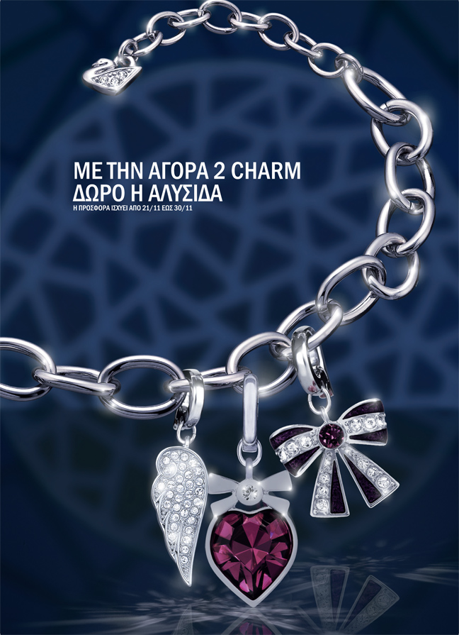 Σε μια μοναδική προσφορά προχωρά η Swarovski για λίγες ημέρες. Όσοι επισκεφτούν ένα κατάστημα και αγοράσουν 2 charms θα πάρουν δώρο την αλυσίδα. Η προσφορά ισχύει από την Πέμπτη 21 Νοεμβρίου και για 10 ημέρες.