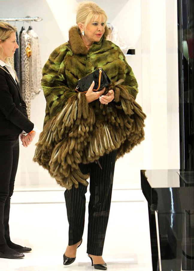 Ivana Trump: Tα πήρε όλα από τον πρώην σύζυγο η κυρία και τώρα τα επενδύει. Στην φωτογραφία βλέπετε πού. Μα καλά κυρία μου, η οικολογική συνείδηση που πήγε; Θα φωνάξουμε και τις φιλοζωικές και την fashion police ταυτόχρονα.