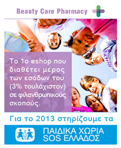 Το Beauty Care Pharmacy είναι το πρώτο ηλεκτρονικό κατάστημα στην Ελλάδα όπου το 3% της αξίας των συναλλαγών που πραγματοποιούνται σε αυτό διατίθεται σε κοινωνικούς και φιλανθρωπικούς σκοπούς. Για το 2013 το 3% από κάθε αγορά σας ενισχύει το έργο των Παιδικών Χωριών SOS Ελλάδος.