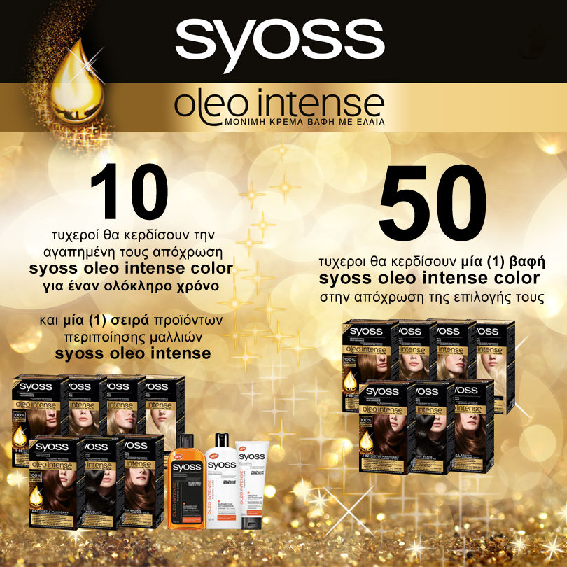 Δέκα τυχερές θα έχουν την ευκαιρία να κερδίσουν την αγαπημένη τους απόχρωση Syoss Oleo Intense Color για έναν ολόκληρο χρόνο, καθώς και μία σειρά προϊόντων περιποίησης μαλλιών Syoss Oleo Intense, ενώ 50 τυχεροί θα κερδίσουν μία βαφή Syoss Oleo Intense στην απόχρωση της επιλογής τους!