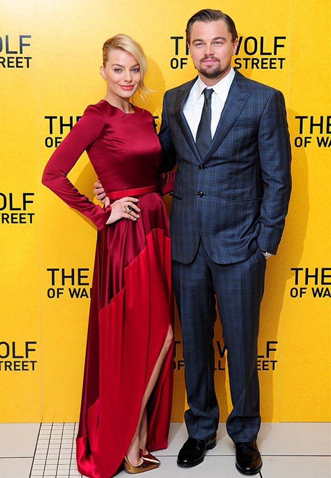 Η Margot Robbie με φόρεμα Oscar de la Renta και παπούτσια Christian Louboutin. Ο συμπρωταγωνιστής της Leonardo DiCaprio φορά κοστούμι Giorgio Armani.