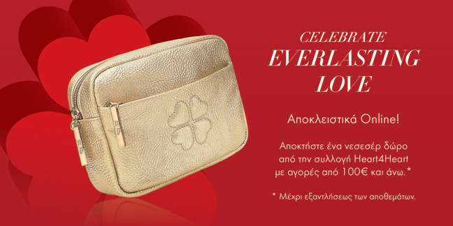 Από τις 12 έως και τις 14 Φεβρουαρίου, με αγορές άνω των 100 ευρώ, ένα μοναδικό, limited edition νεσεσέρ σε χρυσό χρώμα από την iconic συλλογή Heart4Heart θα γίνει δικό σας. Ένα δώρο αγάπης από τη Folli Follie για όσους λατρεύουν το e-shopping και επιλέξουν το ανανεωμένο και εύχρηστο ηλεκτρονικό κατάστημα της Folli Follie για τις αγορές τους. Το χρυσό νεσεσέρ Heart4Heart θα γίνει ο σύμμαχος κάθε γυναίκας, καθώς με στυλ μπορεί φιλοξενήσει όλους τους μικρούς θησαυρούς ομορφιάς, και όχι μόνο.