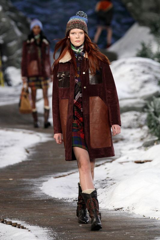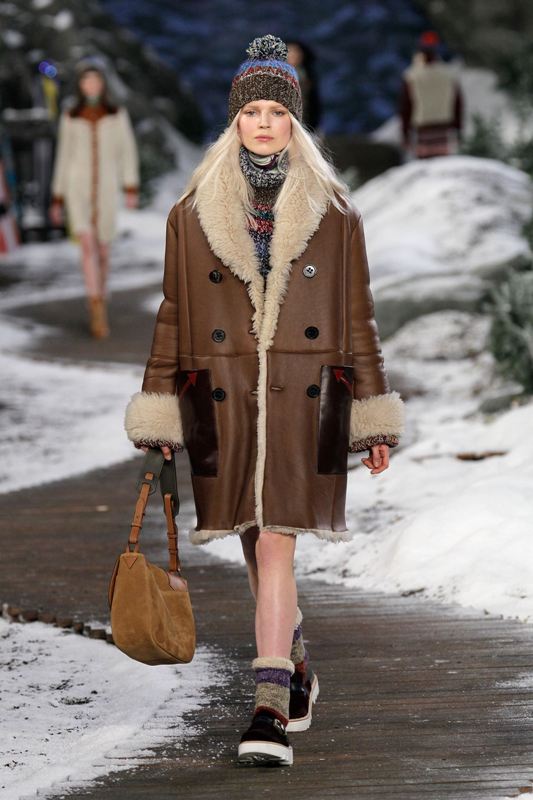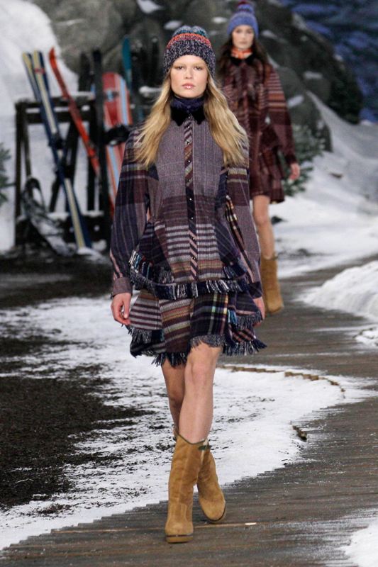 Τα πανοφόρια είναι το κλειδί: teddy-fur bomber jackets βρίσκονται ως στρώσεις πάνω σε δουλεμένα στο χέρι alpine πλεκτά, cable-knit patchworked ponchos συνδυάζονται με citified μπότες πεζοπορίας, σουέτ boyfriend puffer vests κορυφώνουν τα denim.