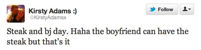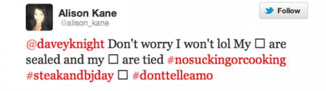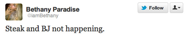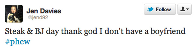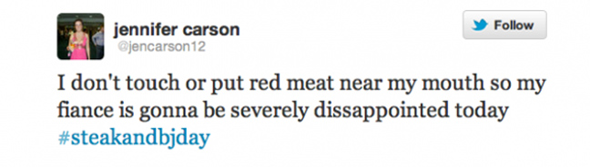 Και τα υπονοούμενα φυσικά δεν λείπουν: «Δεν αγγίζω και δεν βάζω κόκκινο κρέας κοντά στο στόμα μου οπότε ο αρραβωνιαστικός μου θα απογοητευτεί σφοδρά σήμερα»…
