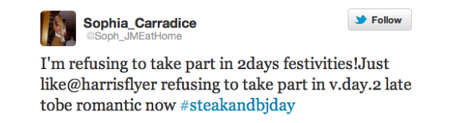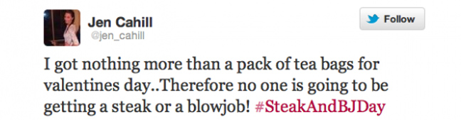 Άλλες πάλι θυμούνται την έλλειψη δώρου στη «δική» τους γιορτή, του Αγίου Βαλεντίνου, και θα ανταποδώσουν τα αδειανά χέρια του καλού τους: «Δεν πήρα τίποτα περισσότερο από μερικά φακελάκια τσαγιού για τη Μέρα του Βαλεντίνου. Γι’ αυτό κανείς δεν θα πάρει μπριζόλα ή πεολειχία»…