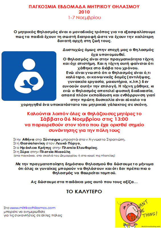 Με αφορμή την παγκόσμια εβδομάδα μητρικού θηλασμού (1-7 Νοεμβρίου) οι θηλάζουσες μανούλες αναλαμβάνουν δράση! Το Σάββατο 06 Νοεμβρίου στις 13:00 θα πραγματοποιηθούν σε διάφορες πόλεις στην Ελλάδα συναντήσεις από θηλάζουσες μητέρες.