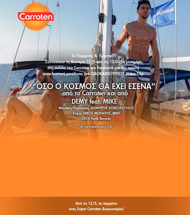Το νέο video clip που καλωσορίζει επισήμως το καλοκαίρι θα παρουσιαστεί τη Δευτέρα 12/05 στις 12 το μεσημέρι μέσα από την σελίδα του Carroten στο Facebook. Μπείτε στη σελίδα της Carroten και πάρτε μία πρώτη γεύση από το νέο video clip.