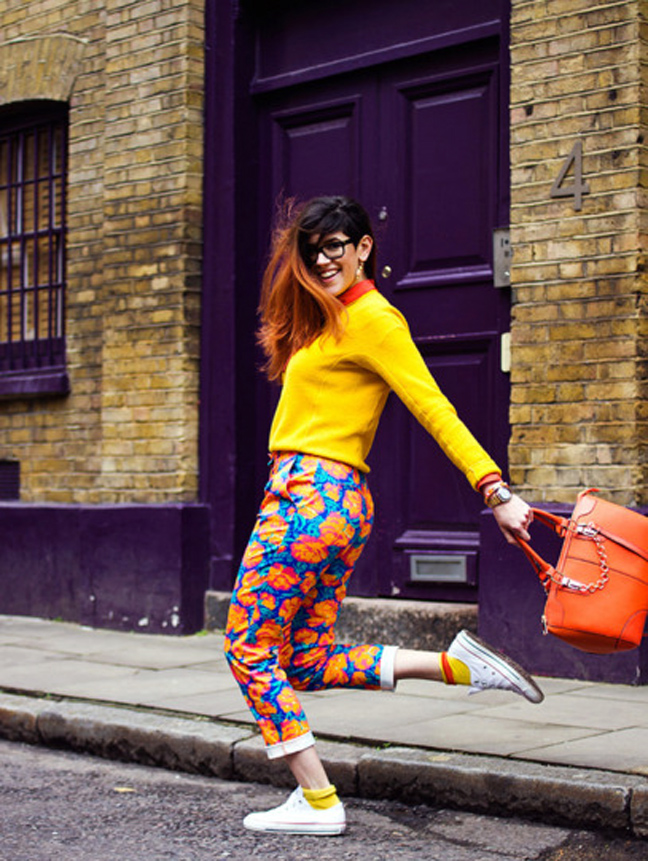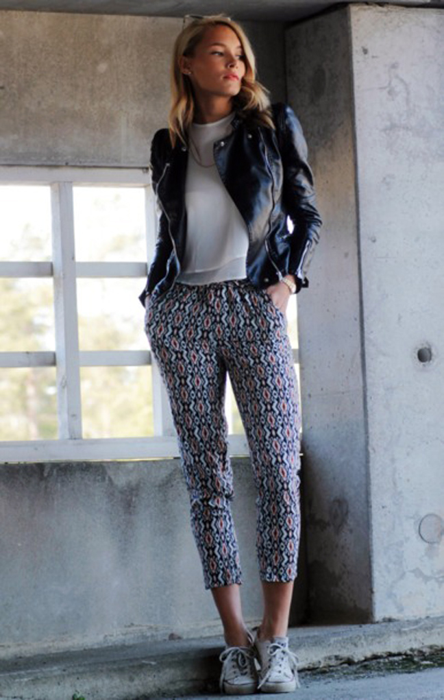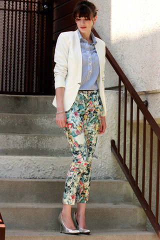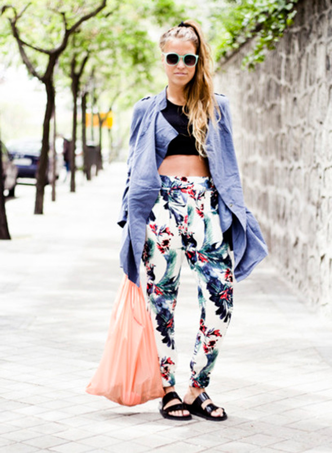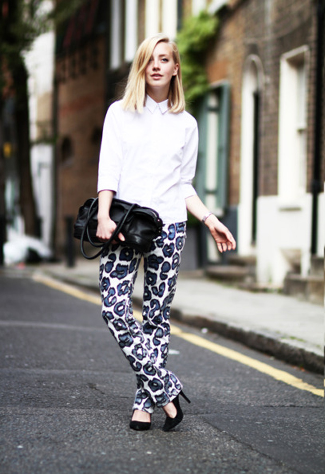 Εάν επιλέξετε ένα παντελόνι με πολύχρωμο ή λουλουδάτο μοτίβο να ξέρετε ότι δεν υπάρχει περιορισμός στο πως θα το φορέσετε. Μπορείτε να το βάλετε άφοβα από το πρωί μέχρι το βράδυ. Το μόνο που πρέπει να προσέξετε είναι τα παπούτσια. Το πρωί είναι καλύτερο να μην το φορέσετε με κλασική γόβα. Φορέστε το με sneakers εάν δεν έχετε κάποια υποχρέωση ή πλατφόρμες, εάν το παντελόνι έχει φαρδιά γραμμή. Το άσπρο πουκάμισο είναι μπαλαντέρ στην προκειμένη περίπτωση γιατί εξισορροπεί την πολυφωνία του παντελονιού και είναι κάτι που επίσης φοριέται από το πρωί μέχρι το βράδυ.
